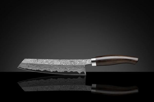 Bei der Serie Exklusiv C100 wird Hochleistungswerkzeugstahl eingesetzt. Die 350 Lagen Stahl ergeben ein atemberaubendes Muster des wilden Damastes. Der Stahl enthält einen Kohlenstoffanteil von 1,0%. Kohlenstoff macht die Klinge besonders hart (62-63 HRC) und ermöglicht einen besonders feinen Anschliff der Schneide. Auch bei dieser Serie wird der beidseitig, facettierte Hohlschliff in Handarbeit vorgenommen und macht das Messer besonders scharf.