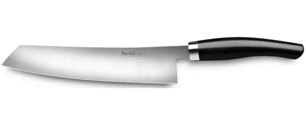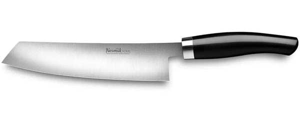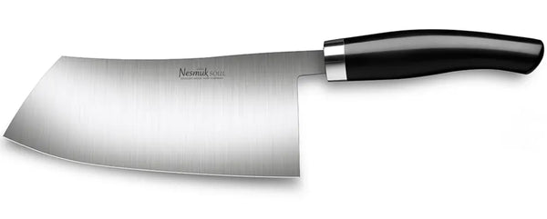 Die nach chinesischen Vorbildern speziell geformte, breite Klinge mit ihrer chrakteristischen Wölbung auf der Oberseite und der zur Spitze hin geschwungenen Schneidkante machen den Wiegeschnitt ebenso zum Vergnügen wie das Hacken und den Transport des Schneidguts. Im Chinesischen Kochmesser von Nesmuk treffen sich Tradition und Moderne. Es wurde in Zusammenarbeit mit chinesischen Spitzengastronomen entwickelt und ist das gelungene Ergebnis der Neuinterpretation einer 3500 Jahre alten Grundform.