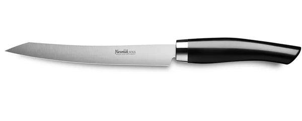Beim Slicer wurde die charakteristische Nesmuk Form auf die schmale Klinge adaptiert. Der Nesmuk Slicer ist mit 26 cm Klingenlänge ein ideales Messer zum Filetieren und eignet sich mit der flexiblen Klinge besonders für exakte Schnitte bei Fisch und Fleisch, sowie um feine Scheiben Schinken zu schneiden.